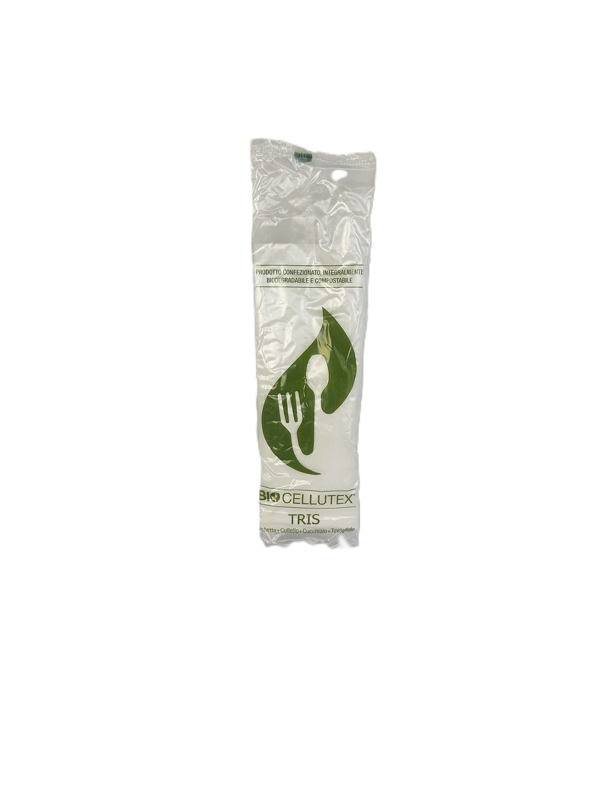 Le posate del tris ”Bio cellutex ”, che è composto da forchetta, coltello e cucchiaio + tovagliolo bianco 33×33 cm, sono in confezioni da 100 pezzi e sono prodotte in CPLA.