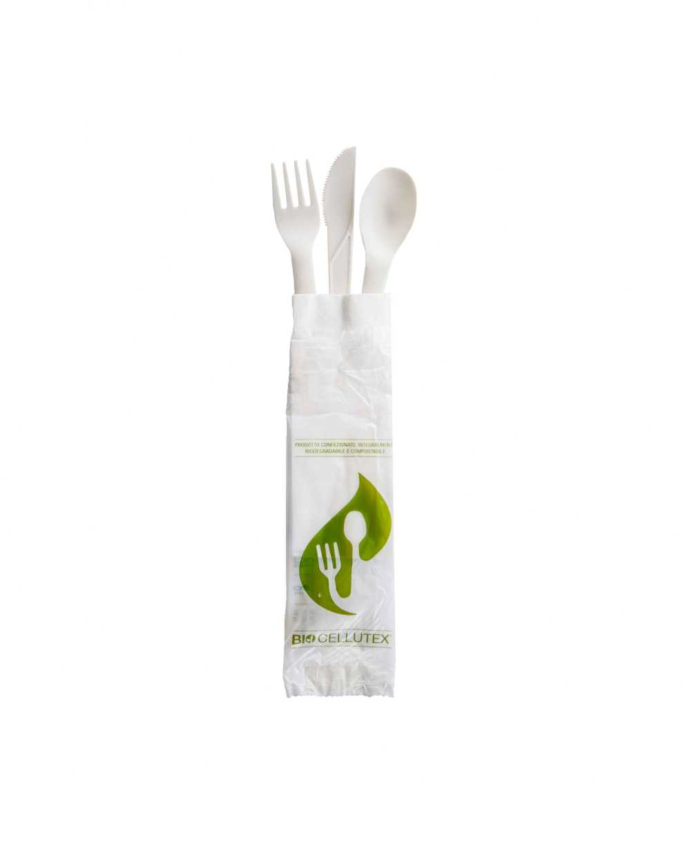 Tris posate in CPLA ”Bio cellutex” + tovagliolo bianco.